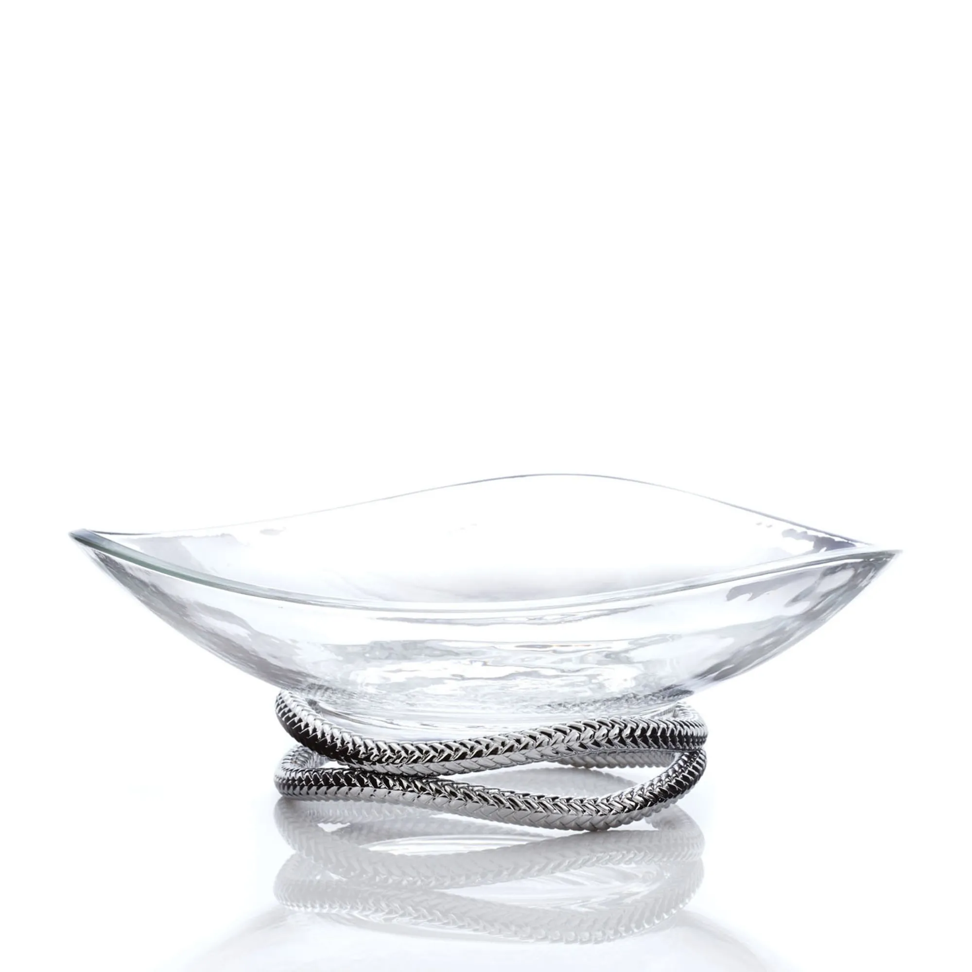 This Sleek Glass Bowl With Gently Curved Corners Rests On An Artful Coil Of Chrome Plate. A Combination Of The Brightly Textured Metal Base And The Serene Expanse Of Glass Give The Braid Centerpiece Bowl A Unique Freshness And Aesthetic Sensibility.