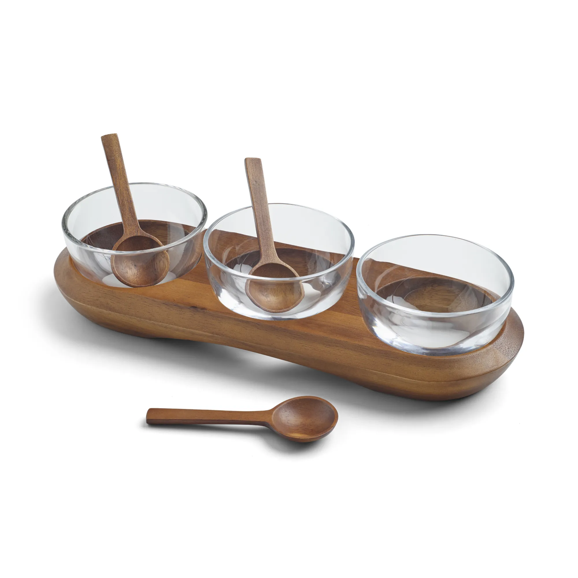 A Brilliant Example Of Mixed Material Design, The Cooper Collection Marries Warm Acacia Wood And Glass To Create A Modern Interpretation Of Serveware. Three Glass Bowls Rest Securely On A Wood Cradle To Create The Cooper Triple Condiment Server. Great For Presenting A Trio Of Dipping Sauces, Nuts, Dried Fruits And More, The Set Includes Three Wood Serving Spoons.