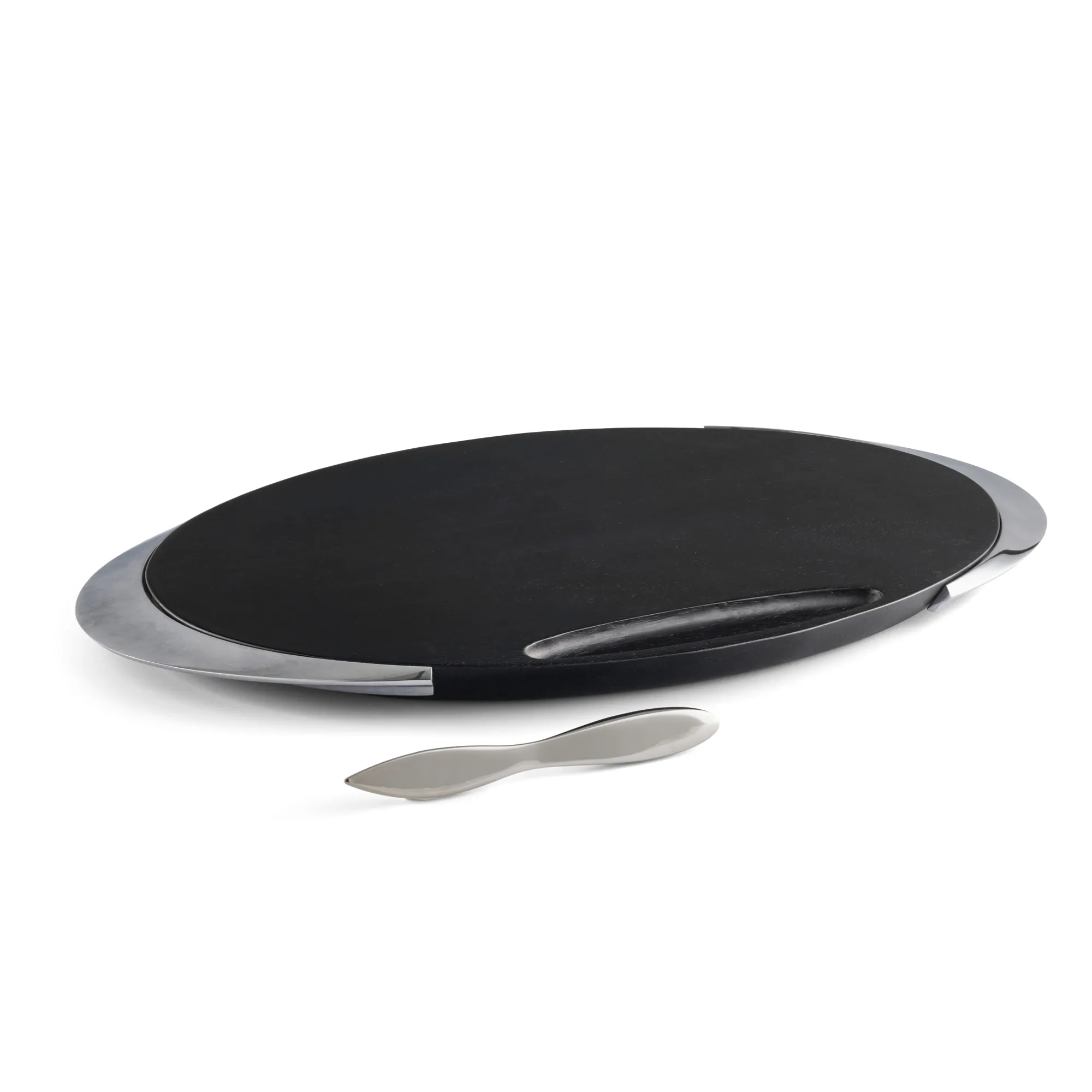 Appearing Near Black In Color, The Noir Collection Applies A Deep, Rich Stain To Its Wood Components, Offering A Contemporary Makeover To Nambe’S Signature Mix Of Acacia Wood And Alloy. The Noir Cheese Board W/ Knife Features Gleaming Alloy Handles That Follow The Curve Of Its Oval Shape, And A Stainless Steel Knife With A Resting Place Built In To The Board. Perfect For Serving Charcuterie, An Array Of Cheeses And More, This Board Is A Sophisticated Entertaining Piece You’Ll Reach For Again And Again.